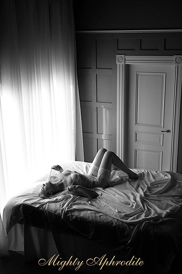 Daylight Boudoir uses our wonderful french windows to create a bedroom set with beautiful soft natural daylight. The light is very flattering and this set offers a good variety of different poses on and around the bed. Images can be demure, softly sexy or erotic - you can even try a mixture of all three. Start in lingerie, a white shirt, a lacy robe or even some loungewear. Then work to topless or nude if you are feeling confident. This studio set gives you lots of options!